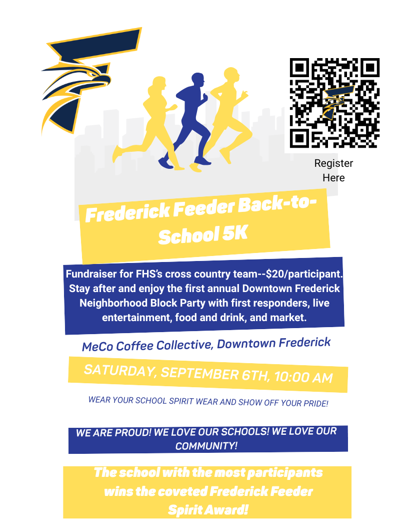 Register now for the Frederick Feeder Back-to-School 5K and help support the Frederick High School Cross Country Team. The race is on Saturday, Sept 6th, at 10am. The cost is only $20/participant. Click the button below for more information and to register for the event.